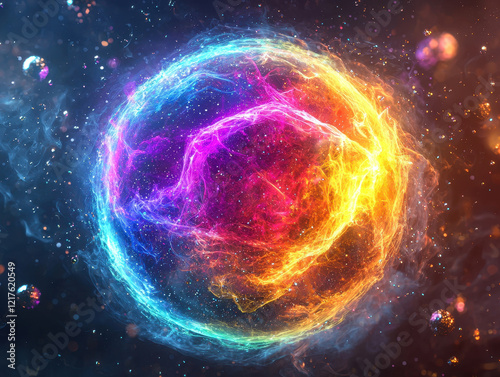 Obraz premium Vibrant abstract light sphere representing a quantum qubit surrounded by radiant energy arcs and cosmic particles in a dynamic, ultra-realistic 8k setting