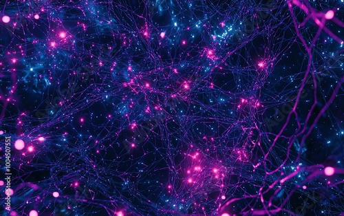 Fototapeta premium Vibrant abstract representation of neural connections glowing in a cosmic purple and blue environment