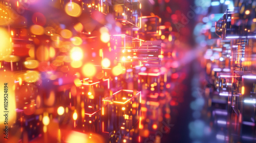 © INT888, Naklejka premium Vibrant abstract representation of quantum computing with glowing cubes and lights, showcasing advanced technology and data processing at high speeds