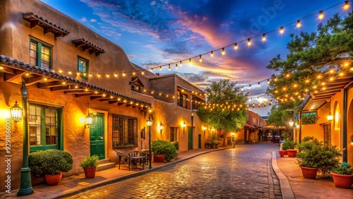 Fototapeta premium Vibrant adobe architecture and twinkling string lights illuminate a quiet New...