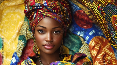 Fototapeta premium Vibrant African Woman in Colorful Headwrap with Stunning Jewelry