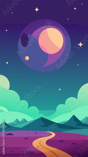 © Jibon, Fototapeta premium Vibrant alien landscape with a winding road under a starry sky and a large planet