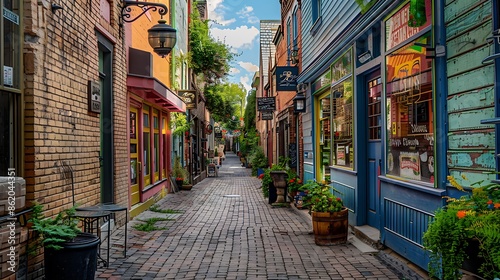 Fototapeta premium vibrant alleyway in a historic district, where each building's brick siding...