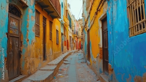 Fototapeta premium Vibrant Alleyway with Colorful Houses, Old City, and Africa.