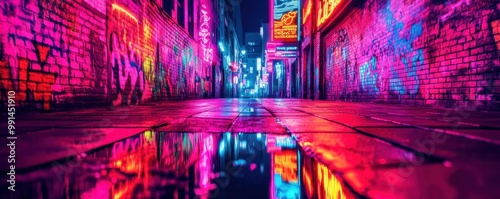 © Manita, Naklejka premium Vibrant alleyway with neon lights reflecting on wet pavement, showcasing urban street art in a colorful night scene.