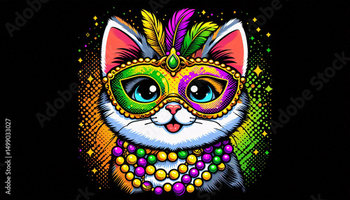 © Olia, Fototapeta premium Vibrant and energetic pop art portrait of cat in beads and mask celebrating Mardi Gras with classic comic book flair