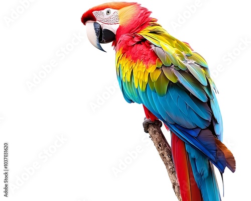 Obraz premium Vibrant and Tropical Parrot Perched on Invisible Branch with Fanned Colorful Feathers on White Background