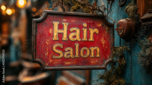 © aicandy, Fototapeta premium Vibrant and weathered red hair salon sign with gold lettering, surrounded by rustic decorations that create a charming and inviting atmosphere