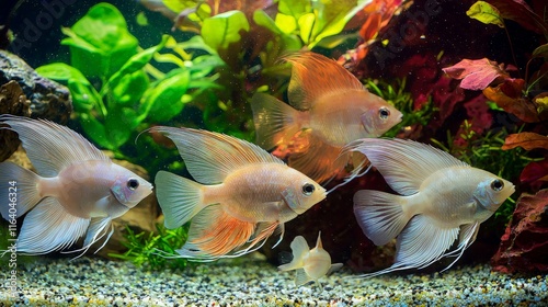 © sobartea, Obraz premium Vibrant angelfish swimming in a lush planted aquarium.