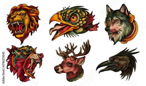 Naklejka premium Vibrant Animal Illustrations with Unique Styles and Detailed Features on...