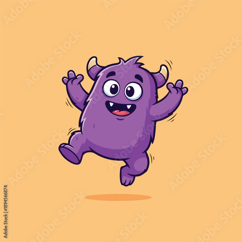 Fototapeta premium Vibrant Animated Purple Monster Character Joyfully Jumping with Arms Raised...