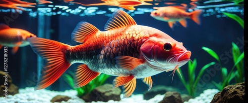 Fototapeta premium Vibrant aquarium scene featuring a large, colorful catfish swimming among...