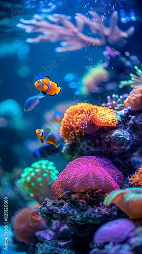 © Nawarit, Obraz premium Vibrant aquarium with a colorful coral reef, tropical fish swimming gracefully, and crystalclear water illuminated by soft lighting