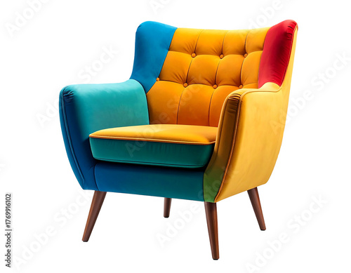 Naklejka premium Vibrant armchair with patchwork design in blue, yellow, and red, isolated on...
