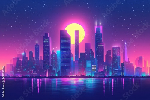 © Georgii, Fototapeta premium Vibrant art of a futuristic city skyline at nighttime with neon lights and a full moon reflecting on the water
