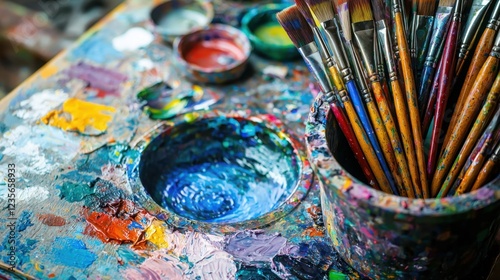 Fototapeta premium Vibrant Art Supplies Arrangement on Wooden Palette and Brushes