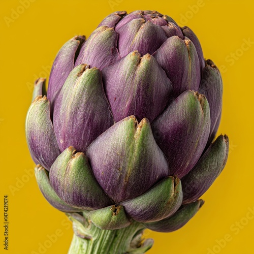 Fototapeta premium Vibrant artichoke, isolated on yellow background, showcasing unique structure...