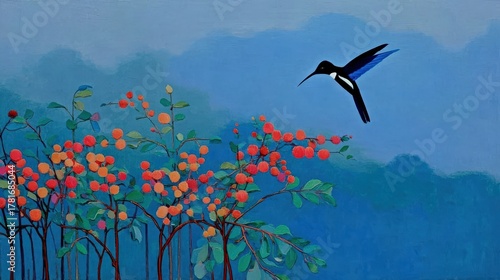 © Piya, Fototapeta premium Vibrant Artistic Hummingbird Hovering Over Colorful Berry Bushes Against a Serene Blue Sky Background in Nature-Inspired Painting