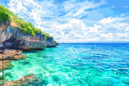 © ubolpun, Fototapeta premium Vibrant Artistic Impression of a Tropical Seascape with Rocky Coastline and Turquoise Waters.