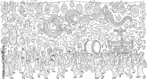 Fototapeta premium Vibrant Asian Festival Parade: Intricate Dragon, Drum, and Lantern Celebration