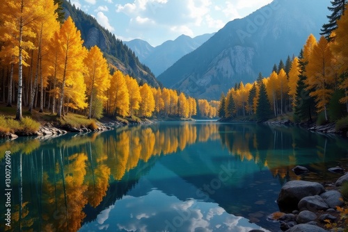 © Yuwadee, Obraz premium Vibrant aspen trees reflected in calm Fish Lake , utah, Utah, trees