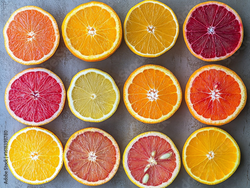 Fototapeta premium Vibrant assortment of citrus fruit slices, including oranges, grapefruits, and lemons, arranged in grid pattern on textured surface. colorful display is fresh and inviting