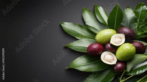© vachiraphan, Obraz premium Vibrant Assortment of Fresh Fruits Nuts and Green Leaves on Wooden Table