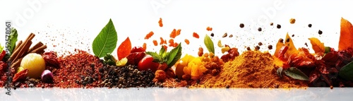 Fototapeta premium Vibrant assortment of spices and herbs on a white background, showcasing...