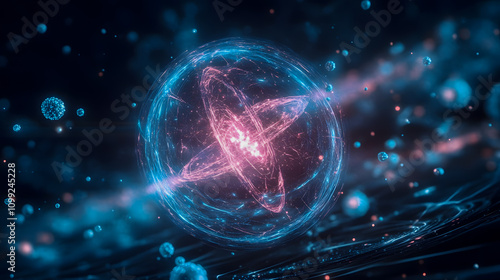 Obraz premium Vibrant Atomic Nucleus Surrounded by Particles and Energy Waves in Futuristic...