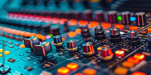 © YuDwi Studio, Obraz premium Vibrant Audio Mixer Console: A Close-Up of Colorful Knobs and Faders