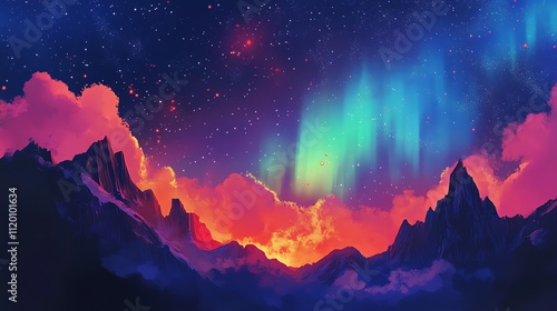 © nurionstudio, Naklejka premium Vibrant aurora borealis illuminating a majestic mountain range at sunset.