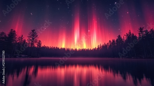 Obraz premium Vibrant auroras illuminate a serene lake surrounded by dense forest under a...