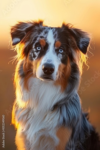 Fototapeta premium Vibrant Australian Shepherd Portrait with Warm Sunlit Backdrop for Pet Lovers