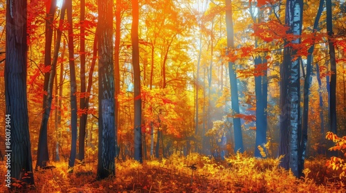 Fototapeta premium Vibrant autumn deciduous forest sunny day foliage with rich colors and...