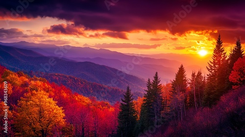 © Thanakan, Obraz premium Vibrant autumn foliage in a mountainous landscape at sunset.