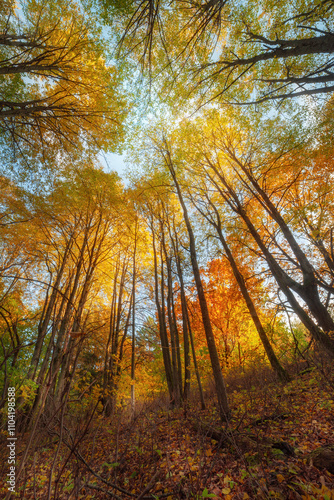 Obraz premium Vibrant autumn forest canopy showcasing colorful leaves under sunny sky in a...