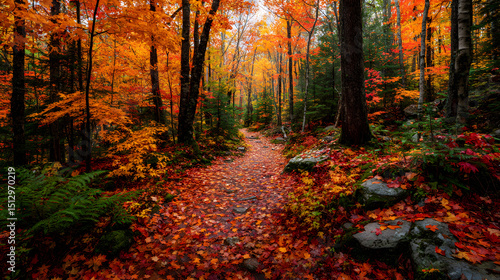 © SMURFFYx, Fototapeta premium Vibrant Autumn Forest Path Covered in Fallen Leaves with Majestic Trees in Full Fall Color