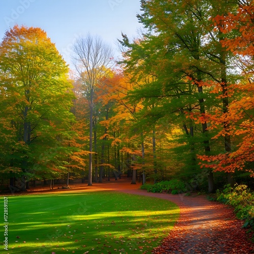 Naklejka premium Vibrant autumn forest scene with a sun-dappled path winding between trees displaying fiery red, orange, and golden foliage, next to a bright green lawn