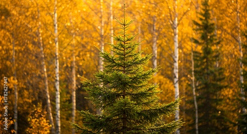 Fototapeta premium Vibrant Autumn Forest with Evergreen and Golden Birch Trees.