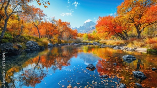 Fototapeta premium Vibrant Autumn Landscape with Bright Foliage and Crystal Clear Reflecting River