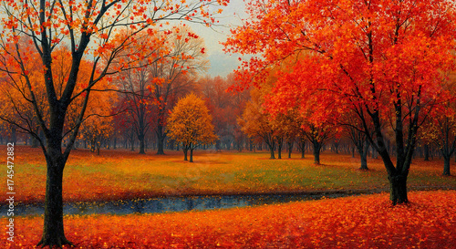 © ShaNeT, Naklejka premium Vibrant autumn landscape with orange trees and a calm river