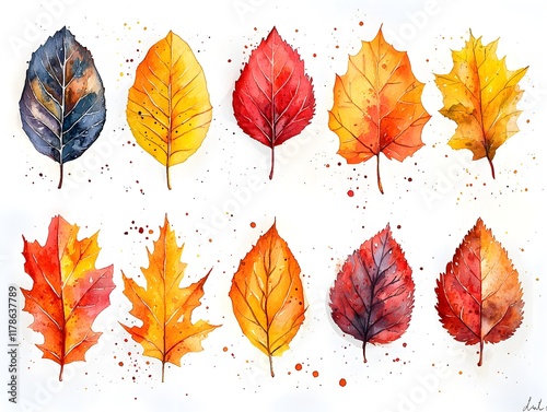 © Bussakon, Obraz premium Vibrant Autumn Leaf Collection with Watercolor Splatters on White Background for Festive Seasonal Decor and