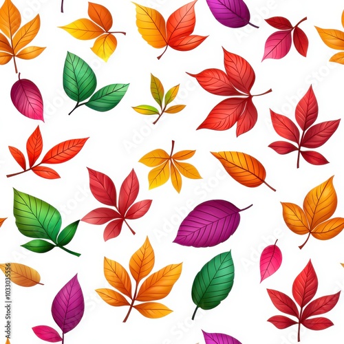 Fototapeta premium Vibrant Autumn Leaf Seamless Pattern with Colorful Red, Yellow, Green, and Purple Leaves on White Background, Abstract Seasonal Design