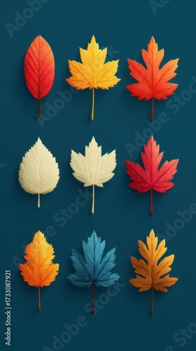Fototapeta premium Vibrant autumn leaves arranged artistically on a blue background showcasing...