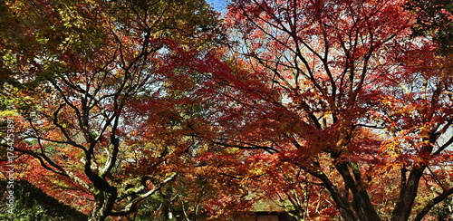 © Cavan, Naklejka premium Vibrant autumn leaves beautifully canopy the serene temple entrance.