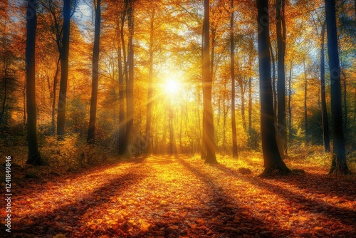 Obraz premium Vibrant autumn leaves blanket a serene forest path in a colorful display of...