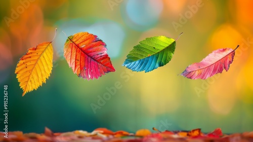 © Jenjira, Fototapeta premium Vibrant autumn leaves floating in mid-air against a colorful blurred background, representing the changing seasons and natural beauty.