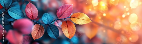 Fototapeta premium Vibrant Autumn Leaves in Orange and Blue Tones Watercolor Background