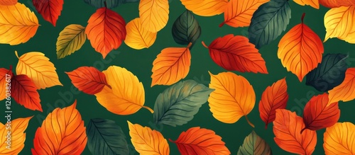© MetaPixel, Obraz premium Vibrant autumn leaves in shades of red, orange, and yellow against a green background perfect for seasonal designs and themes.