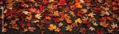 © Jiraporn, Fototapeta premium Vibrant autumn leaves in various shades of red, orange, and yellow create a colorful carpet on a forest floor, symbolizing the beauty of fall season.
